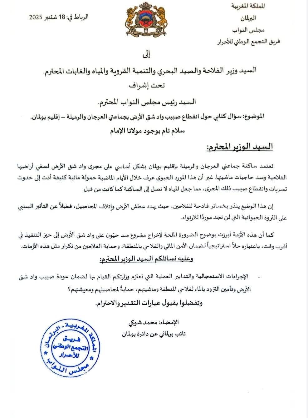 وجه النائب البرلماني محمد الشوكي، عن فريق التجمع الوطني للأحرار، سؤالًا كتابيًا عاجلًا إلى وزير الفلاحة، محذرًا من الآثار المدمرة لانقطاع مياه الري عن الأراضي الفلاحية في جماعتي العرجان والرميلة بإقليم بوعنان. هذه الخطوة تأتي لتعكس حجم الأزمة التي يعيشها الفلاحون في المنطقة.