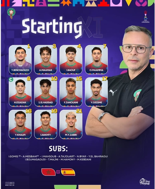 أعلن محمد وهبي، مدرب المنتخب الوطني المغربي لأقل من 20 سنة، عن التشكيلة الرسمية التي ستواجه، مساء يومه الأحد 28 شتنبر، منتخب إسبانيا، وذلك في إطار فعاليات اليوم الأول من المجموعة الثالثة ضمن نهائيات كأس العالم التي تجرى بالشيلي.