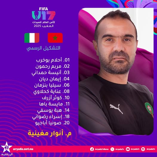 كشف المدرب أنوار مغينية، مساء اليوم الثلاثاء 21 أكتوبر 2025، عن التشكيلة الرسمية للمنتخب الوطني المغربي النسوي لأقل من 17 سنة، استعدادا للمواجهة الودية التي تجمع “لبؤات الأطلس” بنظيراتهن الإيطاليات.
