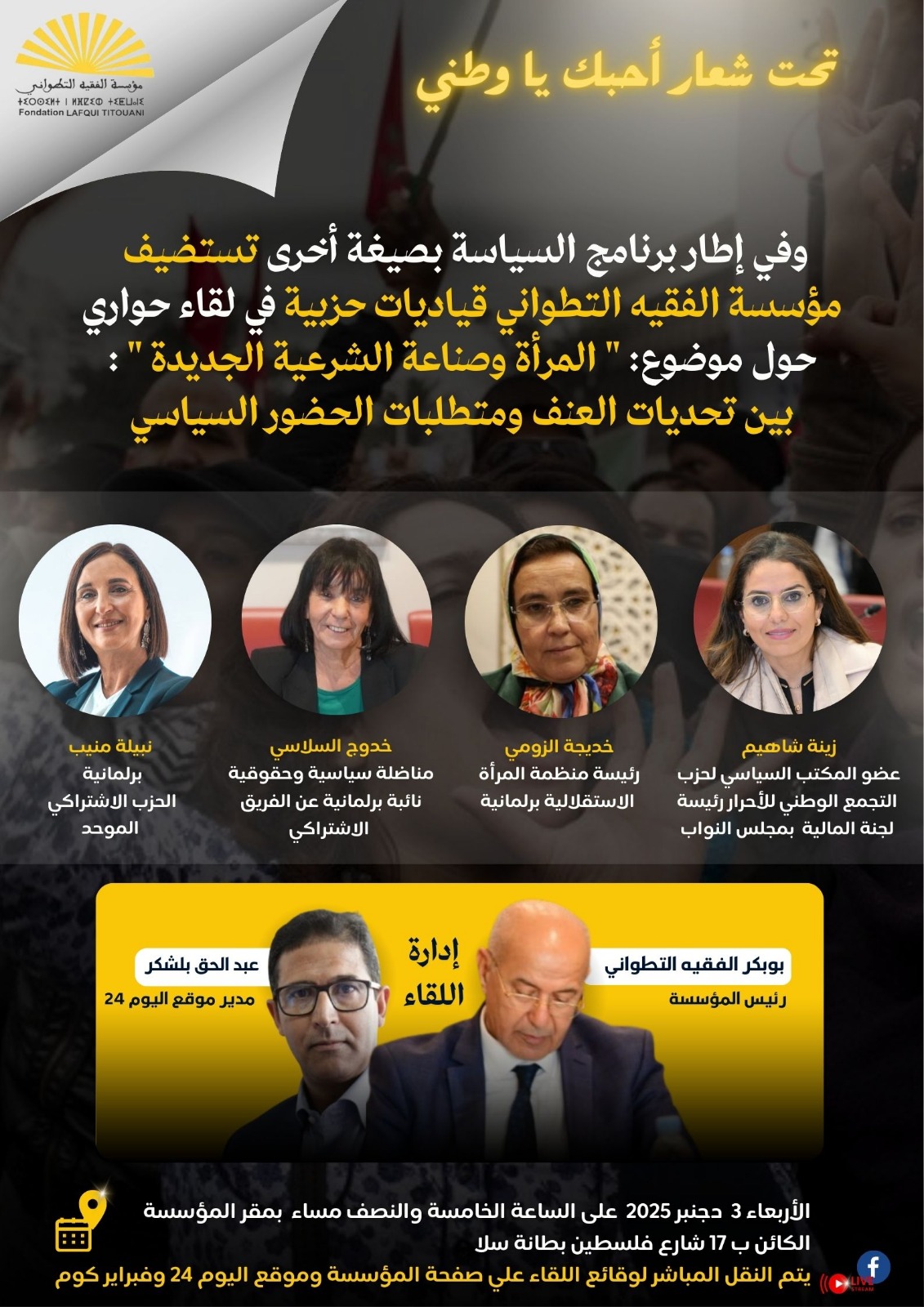 تستضيف مؤسسة الفقيه التطواني اليوم الأربعاء 3 دجنبر 2025 نخبة من القياديات السياسيات في لقاء حواري تحت شعار “أحبك يا وطني”. ويتمحور اللقاء، ضمن برنامج “السياسة بصيغة أخرى”، حول قضية محورية هي: “المرأة وصناعة الشرعية الجديدة: بين تحديات العنف ومتطلبات الحضور السياسي”.