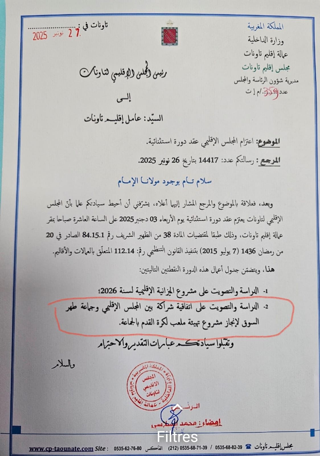 في إطار الدينامية الإيجابية المتصاعدة التي يشهدها إقليم تاونات، انعقد مؤخراً لقاء تواصلي رفيع المستوى جمع السيد محمد السلاسي، رئيس المجلس الإقليمي، والسيد عامل الإقليم، بحضور السادة أعضاء المجلس الإقليمي. وقد تميز اللقاء بأجواء اتسمت بـ الجدية وروح المسؤولية المؤسساتية، حيث هدف إلى تقييم المرحلة المنجزة ورسم آفاق العمل المستقبلي المشترك.