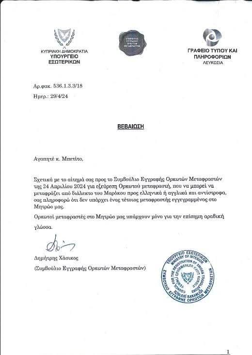 هذه هي “القنبلة” التي يتحدث عنها جيراندو! رسالة إدارية روتينية تخبر سيدة بأنه لا يوجد مترجم محلف للهجة الدارجة المغربية في السجلات القبرصية.