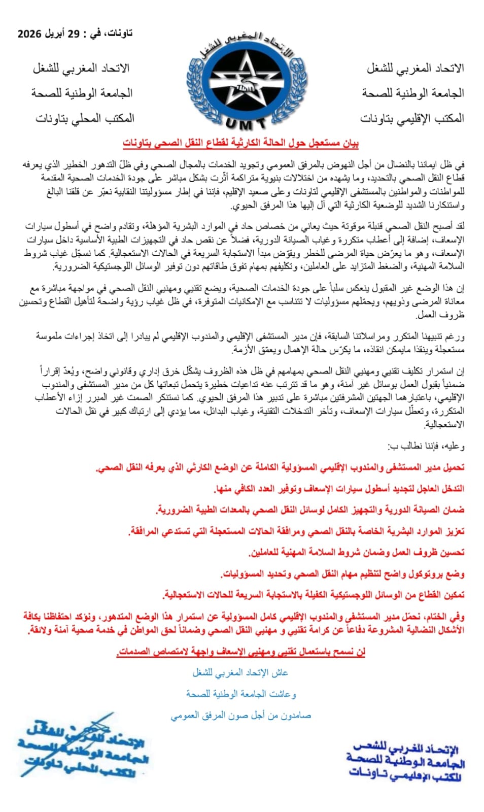 وختم البيان بتأكيد الهيئات النقابية على احتفاظها بحقها في خوض كافة الأشكال النضالية المشروعة، دفاعاً عن كرامة المهنيين، ولضمان حق المواطن التاوناتي في خدمة صحية آمنة ولائقة، تنهي سنوات من الإهمال والتهميش.